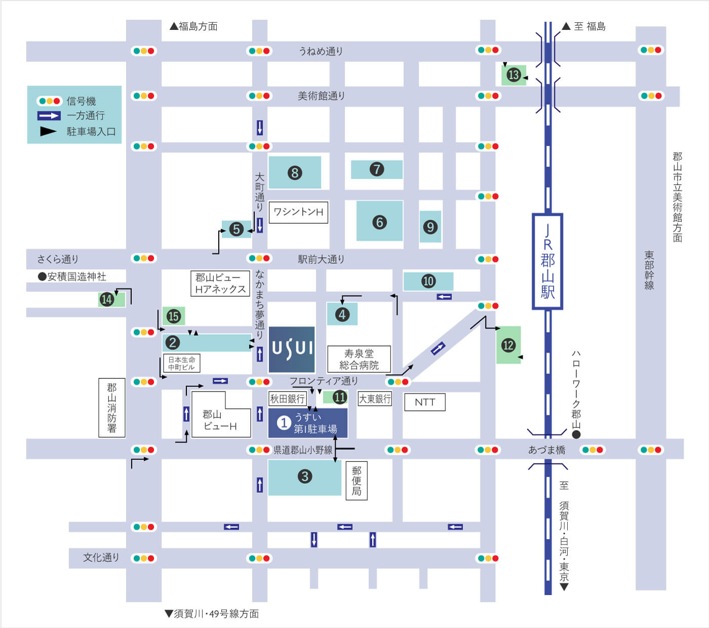 | ⓫県南サービス ⓬ティーワン駐車場 ⓭郡山駅西口駐車場 ⓮ITUMO清水台21駐車場 ⓯ITUMOパーク第6中町駐車場 |