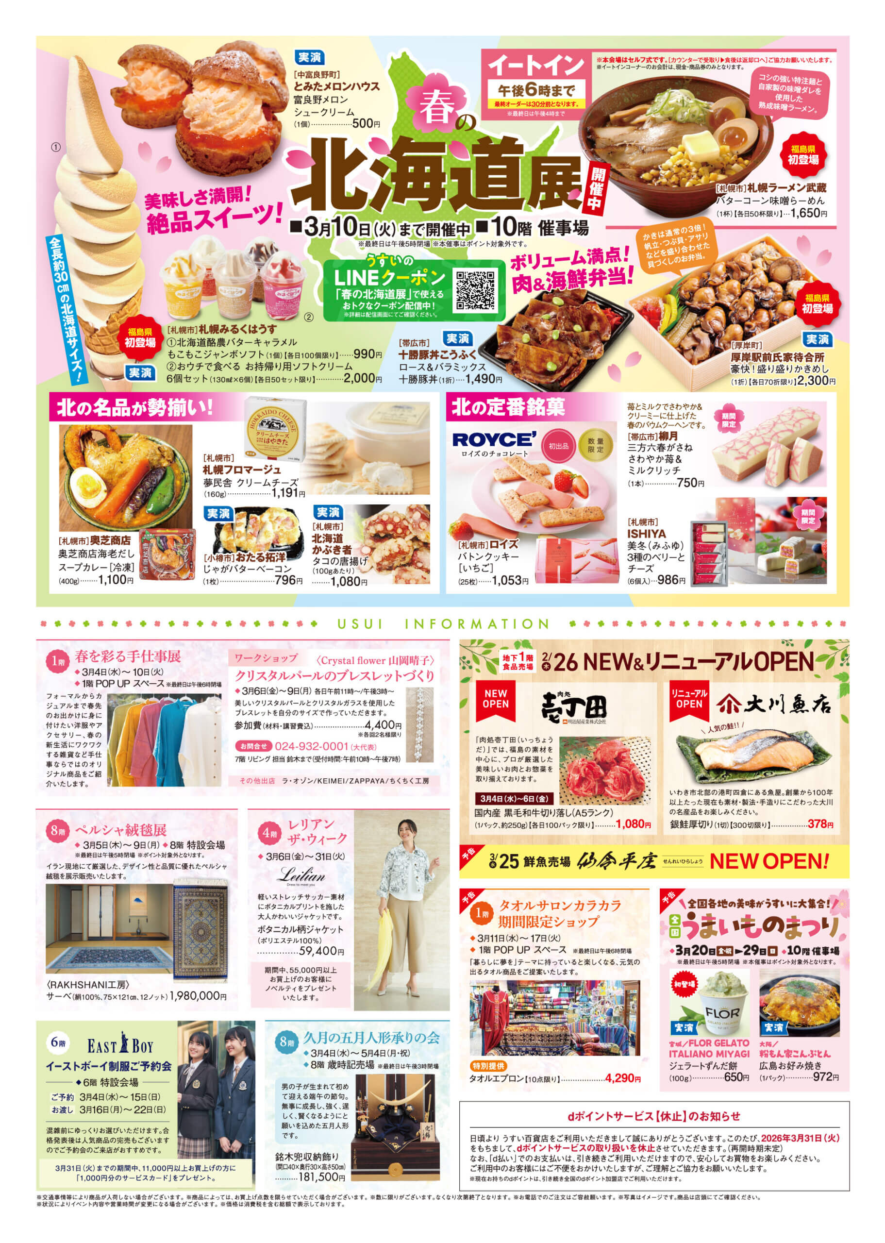 折込チラシ・新聞広告 春の北海道展 [PDF:6MB] SPRING Sweets Marche [PDF:5.6MB] ※PDFをご覧になる際は、Adobe® Reader® が必要となります。 【携帯電話をご利用のお客様へ】 ※携帯電話からはダウンロードできません。 ※別途通信料がかかります。 TVCM