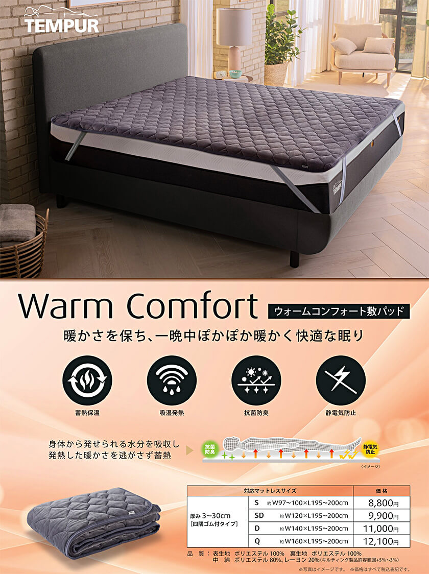テンピュール®の「ウォームコンフォート敷パッド」は、中綿に炭が練り込んであり、遠赤外線を効率よく熱に変換し蓄えてくれます。