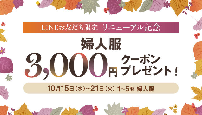 LINEお友だち限定 リニューアル記念 婦人服3,000円クーポンプレゼント!