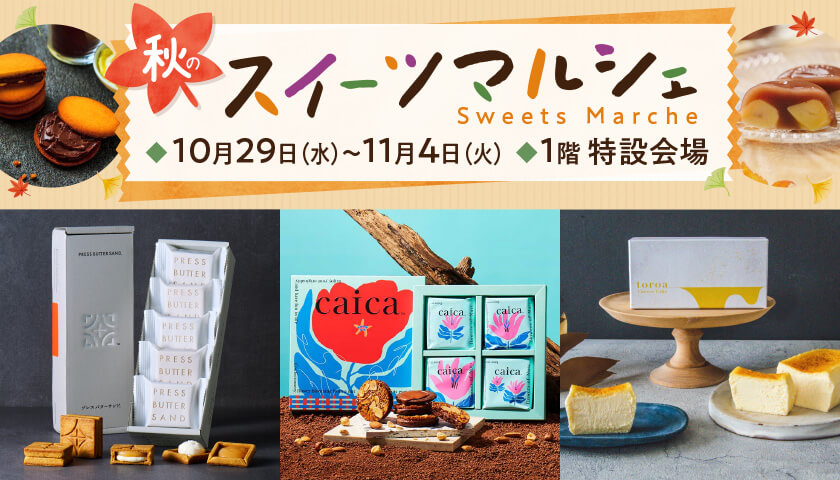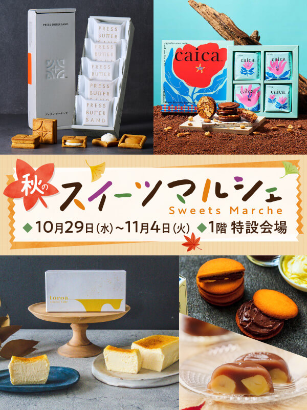 スイーツマルシェ DATE / 2025.10.29(水)〜2025.11.04(火) PLACE / 1F 特設会場 ※最終日は午後6時閉場 ※ポイント対象外となります。 【うすい初登場】N.Y.C SAND N.Y.キャラメルサンド 11月1日(土)限り お一人様1点限り (12個入)2,268円 口どけの良いミルクチョコレートで、生クリーム・黒糖をとろとろに炊き上げたキャラメルを包み込み、オリジナルの焼き印をつけたバターたっぷりの香ばしいクッキーでサンドしました。 PRESS BUTTER SAND バターサンド (5個入)1,215円 バター本来のおいしさを追求し、クリームとキャラメルフィリングをサクサクのクッキーで包んだバターサンドです。 【うすい初登場】caica フロランショコラサンド (4個入)1,296円 香ばしくキャラメリゼしたアーモンドチュイル、食べた瞬間にほどけるザクホロ食感のシュトロイゼル、濃厚なコクのジャンドゥーヤチョコレートの3層で出来た新しいフロランタンです。 toroa とろ生チーズケーキ (340g)3,780円 おとりよせ大賞3年連続の受賞で殿堂入り。 北海道産乳製品への拘りと徹底した温度管理により奇跡のとろ生食感を実現した「とろ生チーズケーキ」は一口、もう一口と止まらなくなる濃厚な味わいです。 【うすい初登場】ツキノワ星菓 とろ生チョコサブレ プレーン (10個入)1,880円 試作を重ねたこだわりのサブレは、発酵バターの芳醇な薫りが広がります。 バニラの甘い香りが心地よく、焦がしキャラメルの隠し味で深みを加えています。 サクサクサブレに挟んでいるクリームは、ホワイトチョコレートと有機ココアパウダーを合わせた濃厚な味わいです。 【うすい初登場】美栗舎 ①栗きんとん化粧箱 (6個)1,620円 ②柿ぼっくり化粧箱 (6個)2,397円 秋冬にしか食べられない栗きんとんや干柿で栗きんとんを包んだ「柿ぼっくり」、手作りの2種類のどら焼きなど様々な栗菓子をお楽しみいただけます。 山田屋まんじゅう 山田屋まんじゅう化粧箱 (6個入)972円 北海道十勝産の良質な小豆を100%使用し、丹念に練り上げたこし餡を薄皮で包んだ「ほどよい甘さで、後口がよい」のが特徴の、一口サイズのおまんじゅうです。 栗水羊羹 (1個)459円 国内産の和栗が丸々2粒入っており、食べ応えのある秋味の水羊羹です。