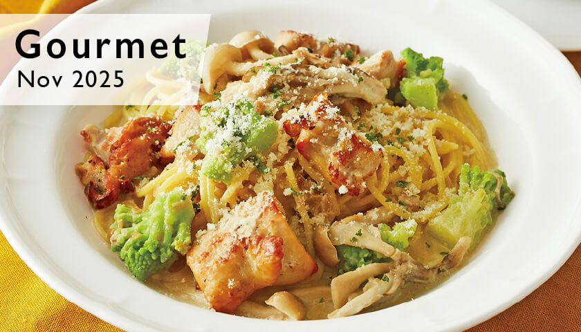 ポルチーニや、たまり醤油などを使用したコクのあるクリームソースに、ローストチキンと舞茸、しめじ、ロマネスコを合わせました。