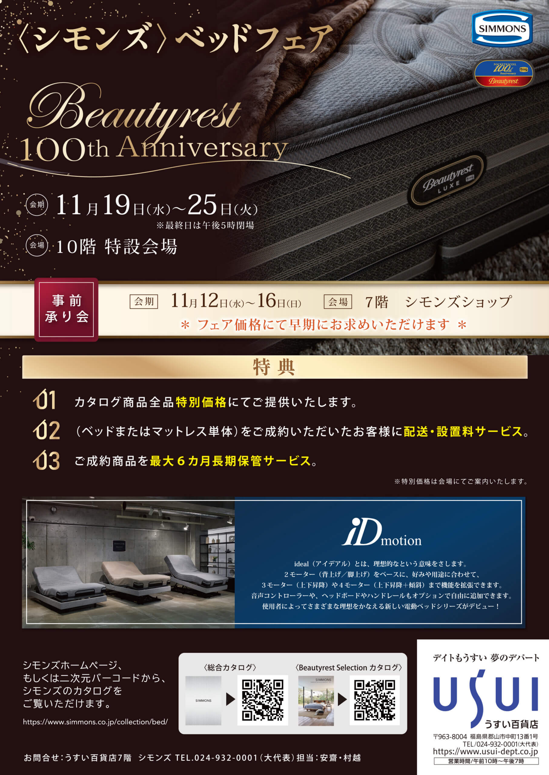 〈予告〉シモンズベッドフェア Beautyrest 100th Anniversary DATE / 2025.11.19(水)〜2025.11.25(火) PLACE / 10F 特設会場 世界中の一流ホテルが採用する極上の眠りを、フェア限定の特別価格にてご提供いたします!! ロングセラーの定番マットレスから新作電動リクライニングベッド、お得な限定モデルなど多数のアイテムを取り揃えております。 まだ知らない、あなたの理想の眠りにきっと出会えます。 〈会期中特典〉 ①対象商品を特別価格にてご提供 ②ベッドまたはマットレスご成約で配送・組立て料無料 ③お買上げ商品最大6ヶ月間の長期無料保管サービス 〈事前承り会〉開催中!! 会期:11月16日(日)まで 会場:7階 シモンズショップ フェア価格にて早期にお求めいただけます! ぜひ、ご利用くださいませ。