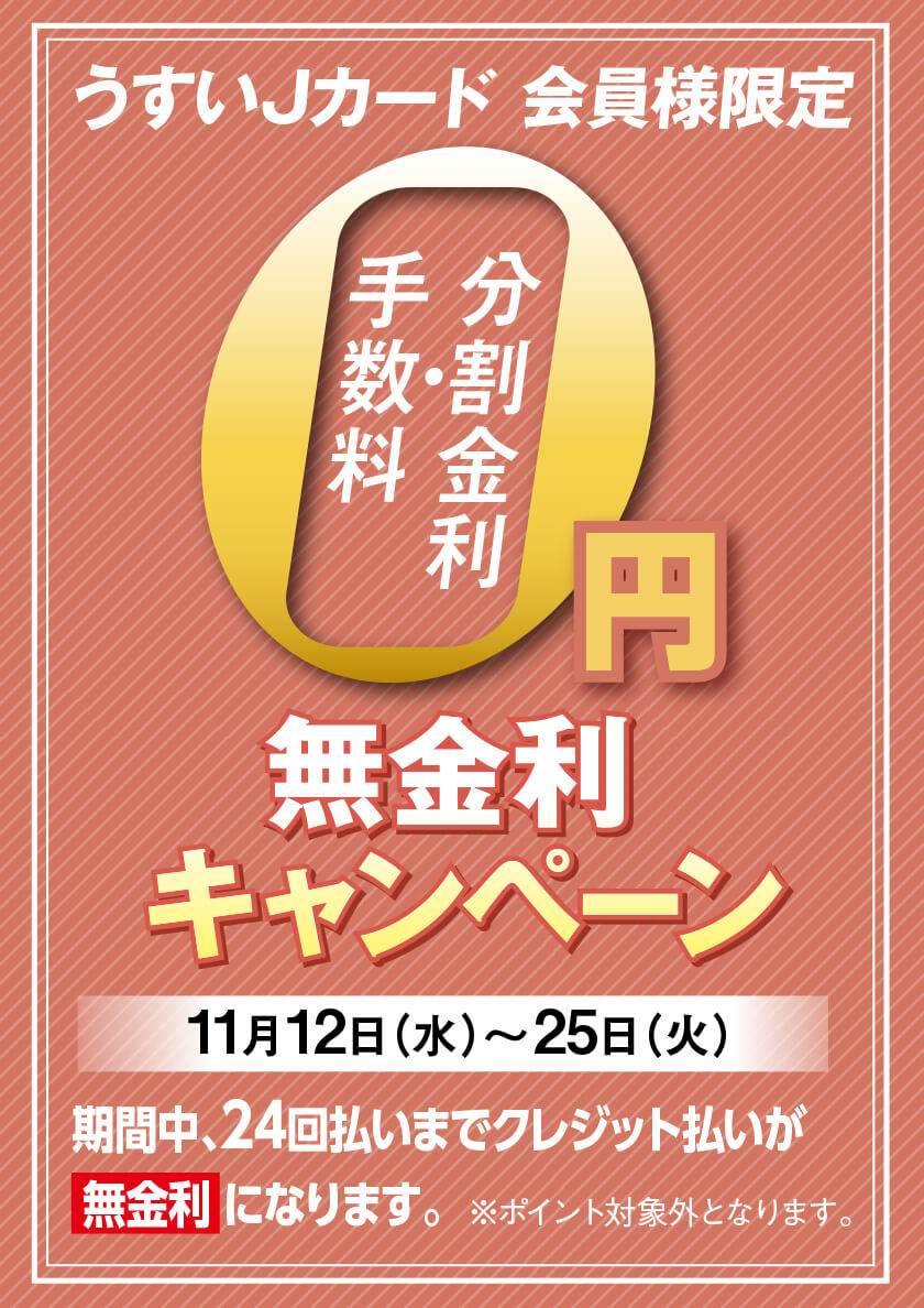 うすいJカード会員様限定 無金利キャンペーン DATE / 2025.11.12日(水)〜2025.11.25(火) うすいJカード会員様限定! 期間中、館内でのお買物に「うすいJカード」のクレジット払いをご利用いただくと、24回払いまで分割金利・手数料が無料になるキャンペーンを開催いたします。 ぜひこのお得な機会に、うすい百貨店でのお買物をお楽しみくださいませ♪ ※ポイント付与対象外となります。