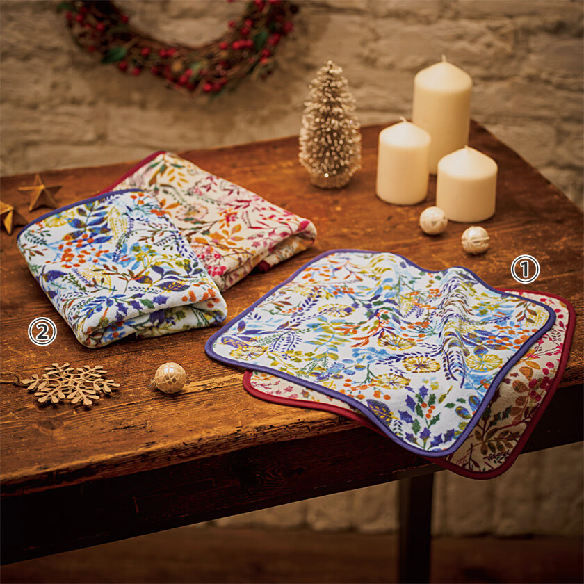 ユーカリ・モミ・ヒイラギ・サンキライの実など、リースの材料となる植物が散りばめられた、クリスマスを彩るタオルです。