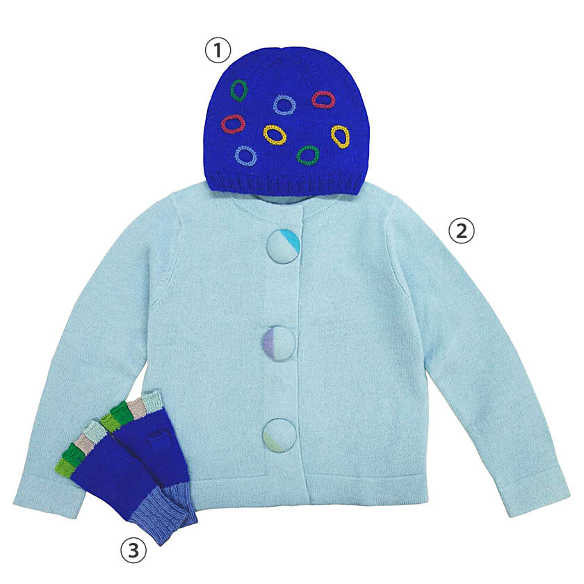 青いニット帽と手袋と合わせて、冬のおしゃれをお楽しみください。
