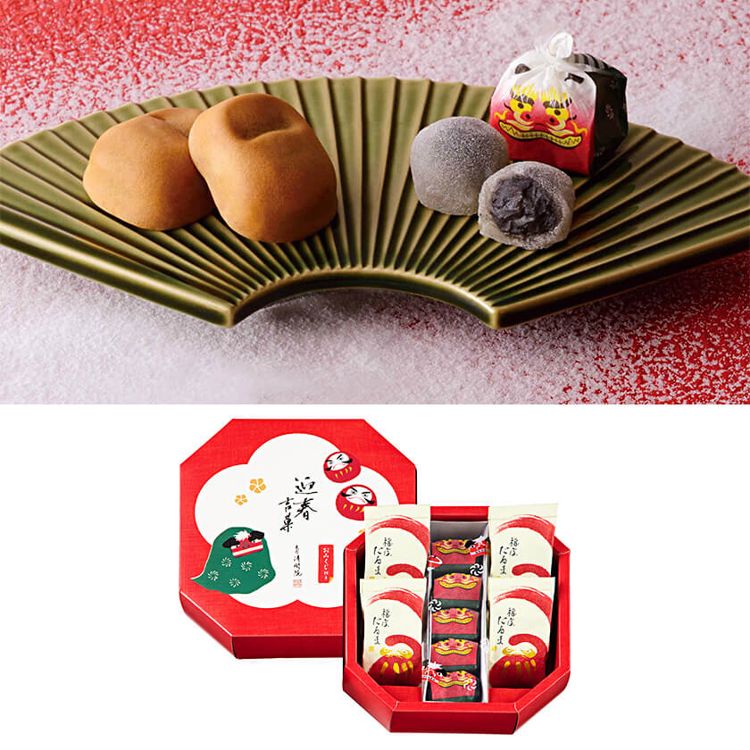 キャラメル餡のお饅頭「福宝だるま」と黒胡麻餡を求肥で包んだ「お獅子」の詰め合わせ。