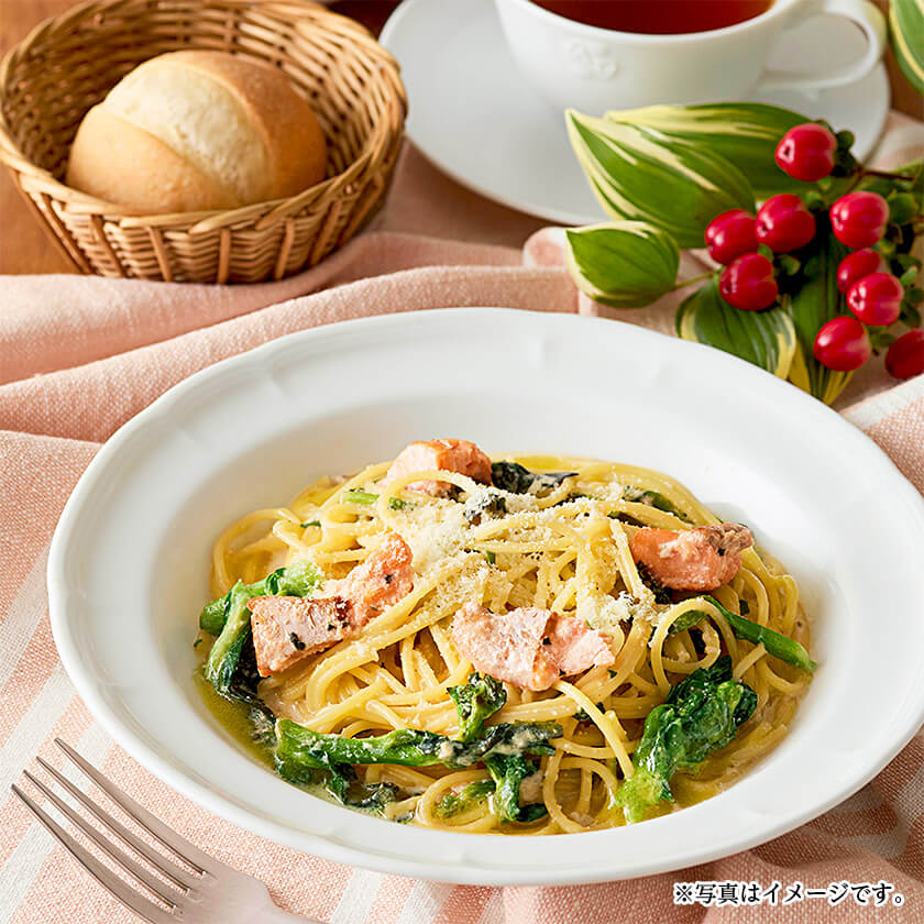 明太子にアンチョビ、パルメザンチーズを加えたソースに、サーモンと菜の花を合わせました。