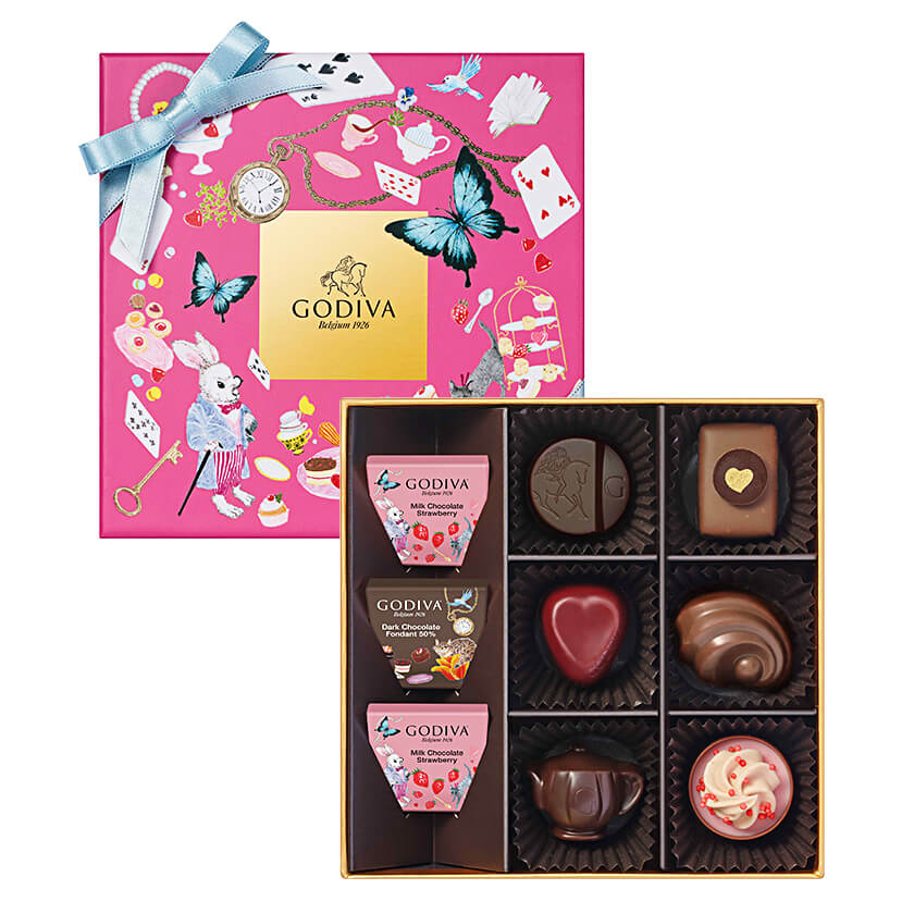 ティーパーティを彩る紅茶をイメージしたチョコレートやゴディバの100周年を記念してリニューアルされたハート形のチョコレート、シーズン限定カレなどを、物語のシンボルのトランプやティーセット、白うさぎ達をちりばめたパッケージに詰め合わせました。
