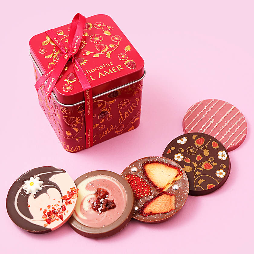 苺の香りと、甘酸っぱさを生かした板チョコレートを可愛らしい苺模様の缶に詰め、華やかなギフトにしました。
