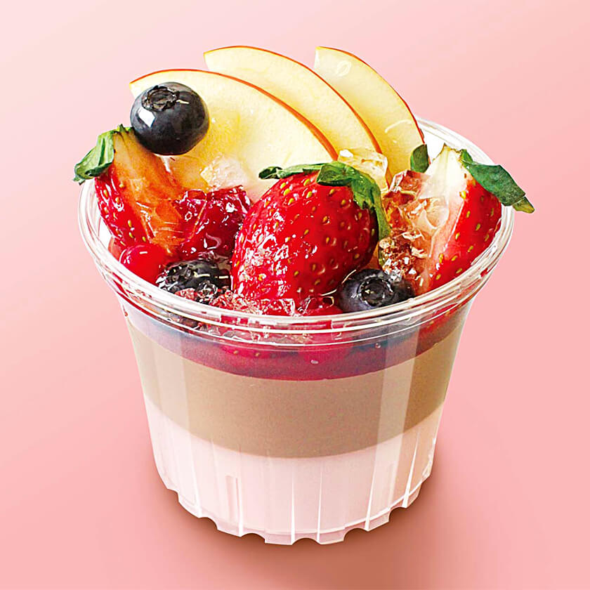 甘酸っぱいサワーチェリーのヨーグルトにチョコババロアを重ね、いちごやりんごの果実を飾りつけた3層のカップデザート。