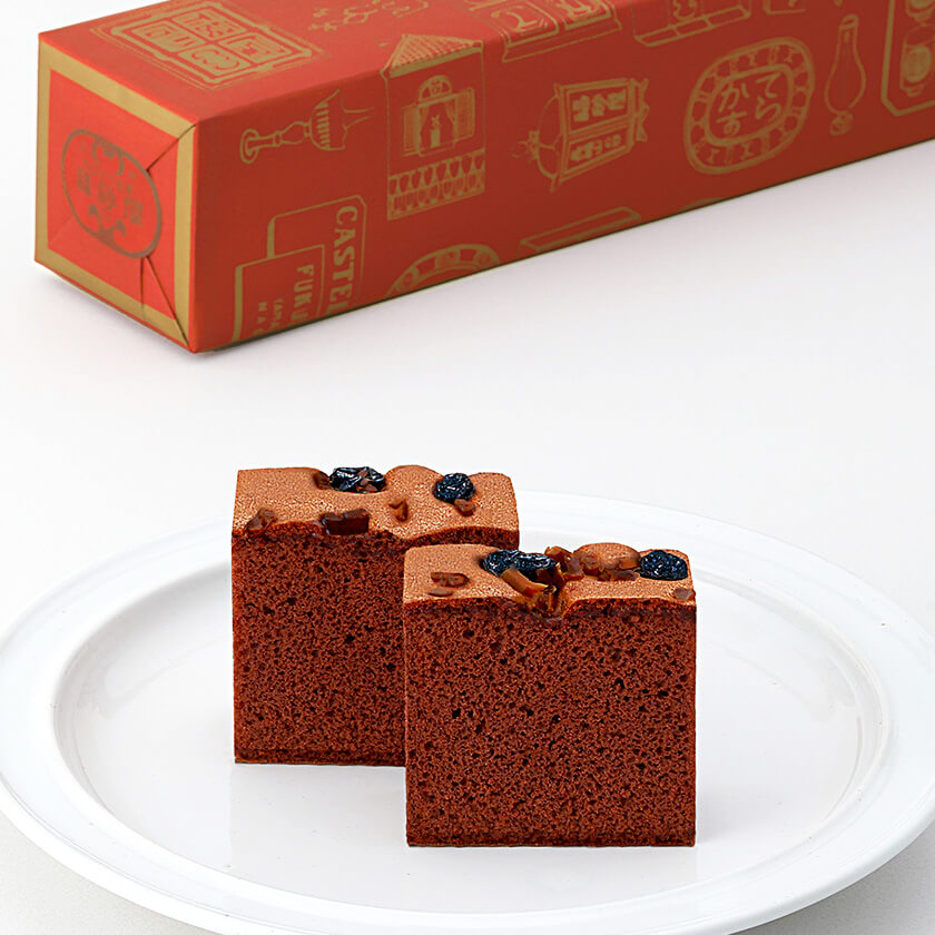 伝統のカステラに香り高い良質のココア、胡桃、レーズンがかもしだすまろやかな味わい。