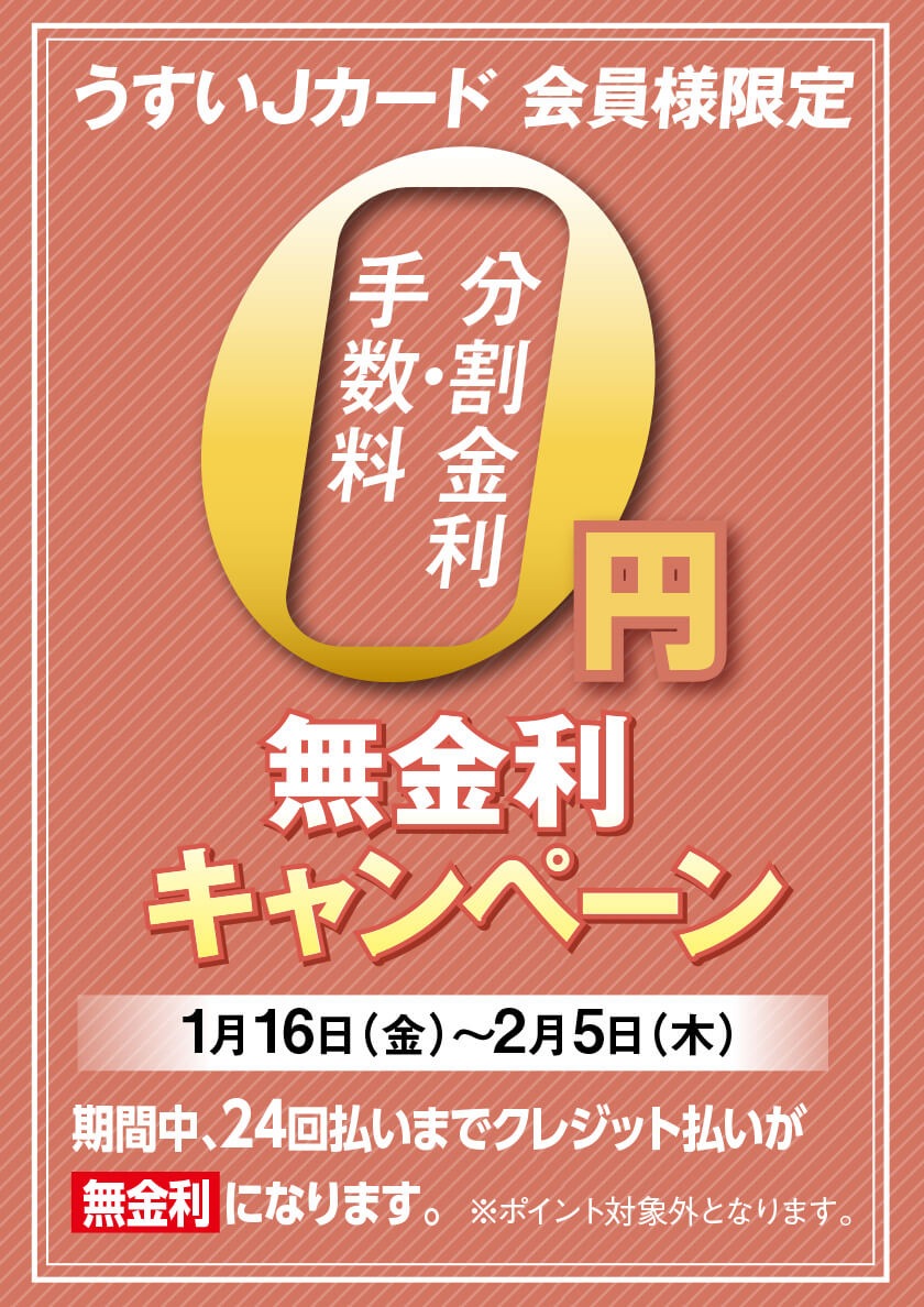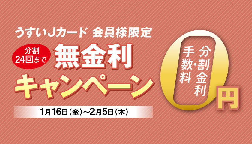 うすいJカード会員様限定 無金利キャンペーン DATE / 2026.01.16(金)〜2026.02.05(木) うすいJカード会員様限定! 期間中、館内でのお買物に「うすいJカード」のクレジット払いをご利用いただくと、24回払いまで分割金利・手数料が無料になるキャンペーンを開催いたします。 ぜひこのお得な機会に、うすい百貨店でのお買物をお楽しみくださいませ♪ ※ポイント付与対象外となります。