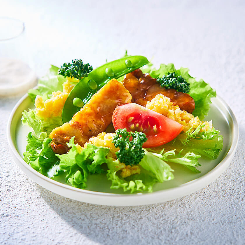 香ばしくローストしたチキンに、甘めの醤油だれを絡めて風味よく仕立て、卵や色鮮やかな素材を合わせたサラダです。