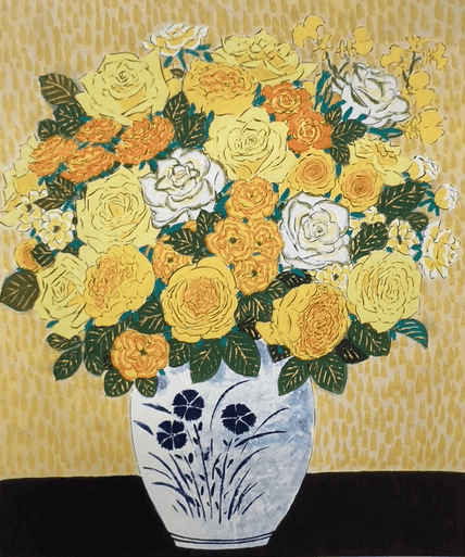 伝統的な岩絵具と墨を用い、モダンな感性で花のいのちを描き出す青木乃里子氏。