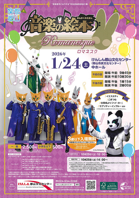 公演名 音楽の絵本 Romanesque 会期 2026.01.24(土) 〈午前の部〉開場 9:45 開演 10:30〈午後の部〉開場 13:15 開演 14:00 会場 けんしん郡山文化センター 中ホール 座種料金 〈午前の部〉〈午後の部〉 一般 2,500円 小学生以下 500円 その他・備考 ※3歳以下入場無料(保護者のひざ上でご覧ください) ※3歳以下のお子様であってもお席が必要な場合は有料 プレイガイド 2025.10.31(金) 開場 17:45 開演 18:30 三浦一馬 五重奏団<キンテート>―情熱のタンゴ― 2025.10.30(木) 開場 18:00 開演 18:30 魅惑のリコーダー&ピアノ 2025.11.30(日) 開場 13:30 開演 14:00 福島オペラ協会 第15回 メンバーズコンサート