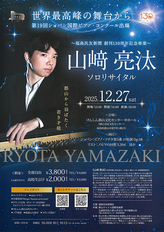 公演名 山﨑亮汰 ソロリサイタル 会期 2025.12.27(土) 開場 13:30 開演 14:00 会場 けんしん郡山文化センター 中ホール 座種料金 全席自由 一般 3,800円 高校生以下 2,000円 その他・備考 ※未就学児入場不可 プレイガイド 2026.01.12(月) 開場 12:30 開演 13:30 みんなで歌う第九の会 第13回演奏会 新春の第九 2026.04.18(土) 開場 13:30 開演 14:00 田中彩子 ソプラノ・リサイタル 2026 in 郡山 Presented by wowowプラス 2025.10.07(火) 開場 13:30 開演 14:00 ちひろ NEWアルバム発売記念 Concert〜輝きながら〜