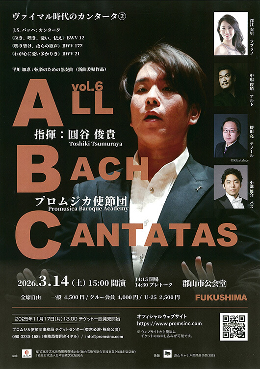 公演名 ALL BACH CANTATAS Vol.6 ヴァイマル時代のカンタータ② 会期 2026.03.14(土) 開場 14:15 プレトーク 14:30 開演 15:00 会場 郡山市公会堂 座種料金 全席自由 一般 4,500円 U-25 2,500円 その他・備考 ※未就学児入場不可 プレイガイド 2026.02.20(金) 開場 18:00 開演 18:30 こおりやま落語愛好会 第二〇四回 例会 十一代目 桂文治 落語会 2026.01.18(日) 開場 13:15 開演 14:00 新春 言祝ぎ席 2026.01.24(土) 〈午前の部〉開場 9:45 開演 10:30〈午後の部〉開場 13:15 開演 14:00 音楽の絵本 Romanesque