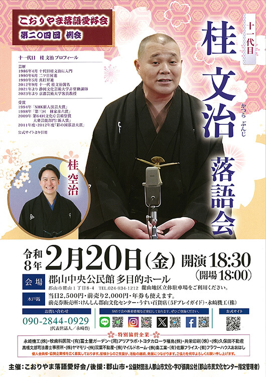 公演名 こおりやま落語愛好会 第二〇四回 例会 十一代目 桂文治 落語会 会期 2026.02.20(金) 開場 18:00 開演 18:30 会場 郡山中央公民館 多目的ホール 座種料金 全席自由 2,000円 プレイガイド 2026.01.25(日) 開場 15:30 開演 16:00 清水ミチコのHAPPY PARADISE 2026.02.14(土) 開演 18:30 モナ・飛鳥/ピアノ・リサイタル 2026.01.12(月) 開場 12:30 開演 13:30 みんなで歌う第九の会 第13回演奏会 新春の第九