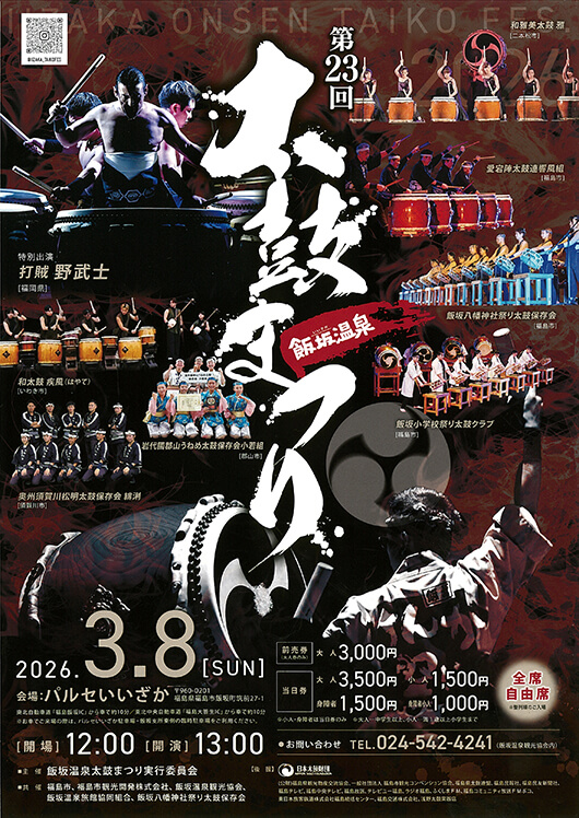 公演名 第23回 飯坂温泉 太鼓まつり 会期 2026.03.08(日) 開場 12:00 開演 13:00 会場 パルセいいざか 座種料金 3,500円 プレイガイド 2026.03.01(日) 開場 15:30 開演 16:00 八神純子 Live 2026 with 塩谷哲〜キミの街へ チョコっとライブ〜 2026.03.15(日) 開場 14:00 開演 15:00 MANSAI CREATION BOX 萬斎のおもちゃ箱in郡山 野村萬斎 with オーケストラ・アンサンブル金沢 2026.02.20(金) 開場 18:00 開演 18:30 こおりやま落語愛好会 第二〇四回 例会 十一代目 桂文治 落語会