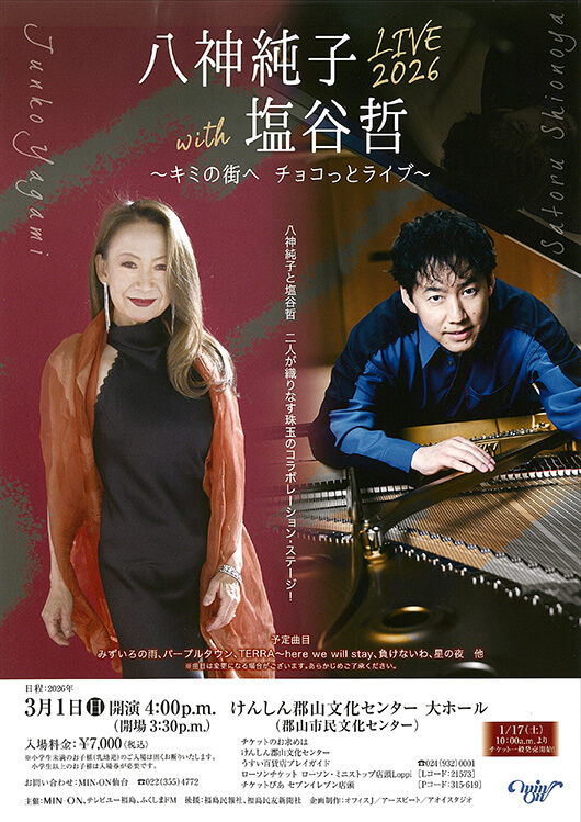 公演名 八神純子 Live 2026 with 塩谷哲〜キミの街へ チョコっとライブ〜 会期 2026.03.01(日) 開場 15:30 開演 16:00 会場 けんしん郡山文化センター 大ホール 座種料金 全席指定 一般 7,000円 その他・備考 ※未就学児入場不可 プレイガイド 2026.02.20(金) 開場 18:00 開演 18:30 こおりやま落語愛好会 第二〇四回 例会 十一代目 桂文治 落語会 2026.04.18(土) 開場 13:30 開演 14:00 田中彩子 ソプラノ・リサイタル 2026 in 郡山 Presented by wowowプラス 2026.02.14(土) 開演 18:30 モナ・飛鳥/ピアノ・リサイタル