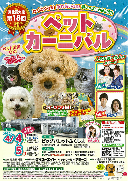 公演名 第18回 ペットカーニバル 会期 2026.04.04(土)・05(日) 会場 ビックパレットふくしま 多目的展示ホール・屋外展示場 会期・期間・会場に対する注釈 4日:午前10:00〜午後6時 5日:午前10:00〜午後5時 座種料金 大人(中学生以上) 1,300円 小学生 700円 ※小学生未満は入場無料 プレイガイド 2026.03.15(日) 開場 14:00 開演 15:00 MANSAI CREATION BOX 萬斎のおもちゃ箱in郡山 野村萬斎 with オーケストラ・アンサンブル金沢 2026.04.18(土)〜2026.06.21(日) 北斎・広重 大浮世絵展〜二代巨匠!夢の競演〜 2026.03.08(日) 開場 12:00 開演 13:00 第23回 飯坂温泉 太鼓まつり