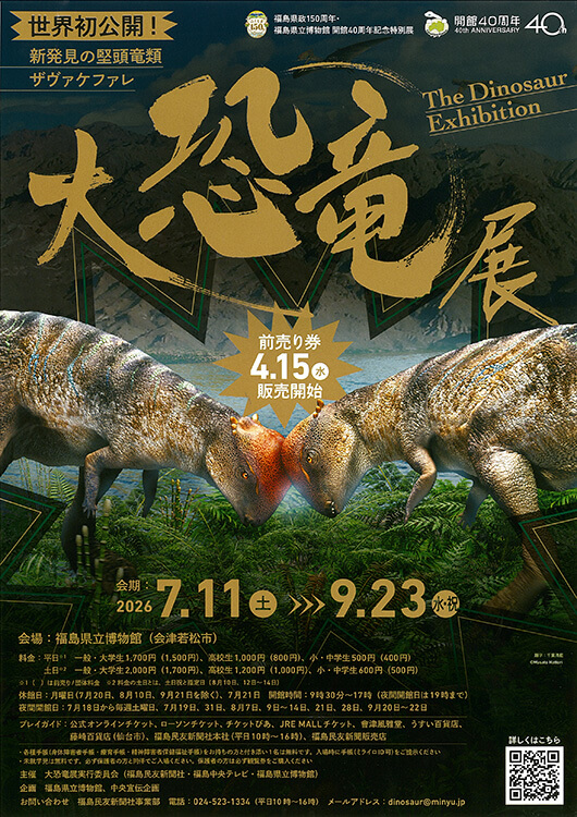公演名 大恐竜展―新発見の堅頭竜類ザヴァケファレ― 会期 2026.07.11(土)〜2026.09.23(水・祝) 開館時間 9:30〜17:00(夜間開館日は19:00まで) 座種料金 〈平日〉 一般・大学生 1,500円 高校生 800円 小・中学生 400円 〈土日祝〉 一般・大学生 1,700円 高校生 1,000円 小・中学生 500円 ※未就学児無料(必ず保護者の方と同伴入場) プレイガイド 2026.07.01(水) 開場 16:00 試合開始 18:00 2026プロ野球パーソナルパシフィック・リーグ公式戦 東北楽天ゴールデンイーグルス東北シリーズ supported by 大東建託 福島日産フクニチャージナイター 東北楽天ゴールデンイーグルスVS千葉ロッテマリーンズ 2026.05.21(木) 開場 18:00 開演 18:30 こおりやま落語愛好会 第二○五回 例会 三遊亭鳳志 落語会 2026.06.27(土) 開場 13:30 開演 14:30 喜多方 酒蔵オペラ「ラ・ボエーム」